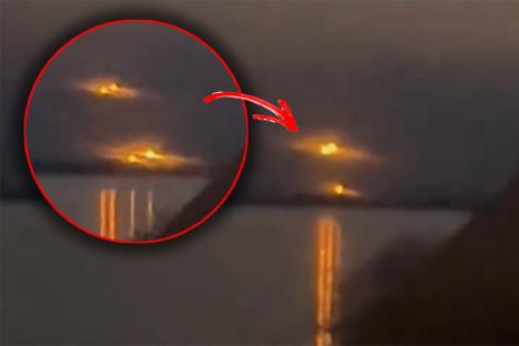 Na snimku se vide dva objekta sa svetlima nalik na sunce kako lete iznad obale reke pre nego što se još dva pojave iza oblaka.