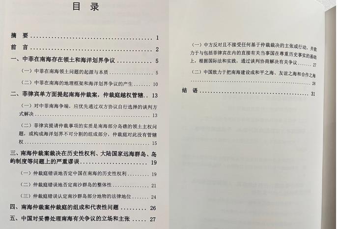Izveštaj je sastavio Huaian centar za pomorsku saradnju i upravljanje okeanima, Nacionalni institut za istraživanje Južnokineskog mora i kinesko Društvo za međunarodno pravo. U njemu je analizirana suštinu sporova, pregledana jurisdikcijalna pitanja arbitražne presude, pružena pravna tumačenja o istorijskim pravima i statusu ostrva i arhipelaga i istraživana zastupljenost arbitražnog tribunala sa ciljem da se razotkriju greške presude i njen negativan uticaj na međunarodni pravni poredak.