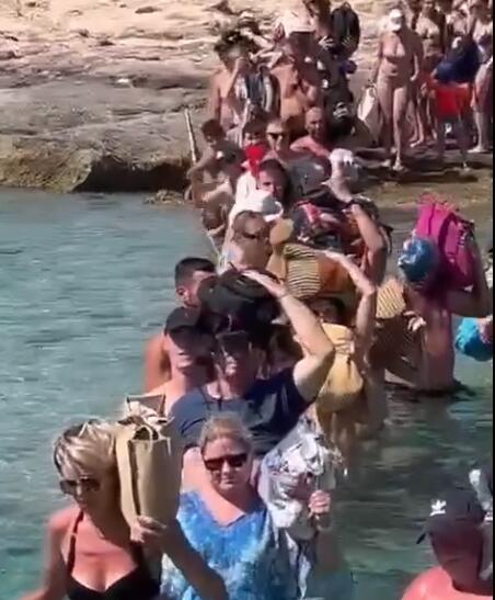 Naime, kako prenose tamošnji mediji, turisti su snimljeni kako nose svoje stvari u rukama iznad glave dok se probijaju od obale do trajekta, a potom "skaču" na platformu broda, pokušavajući bezbedno da se ukrcaju.