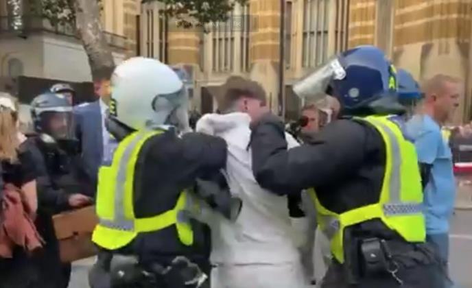 Veliki broj policajaca sa šlemovima formirao je barijeru oko demonstranata, koji su ranije bacali petarde prema Dauning stritu.