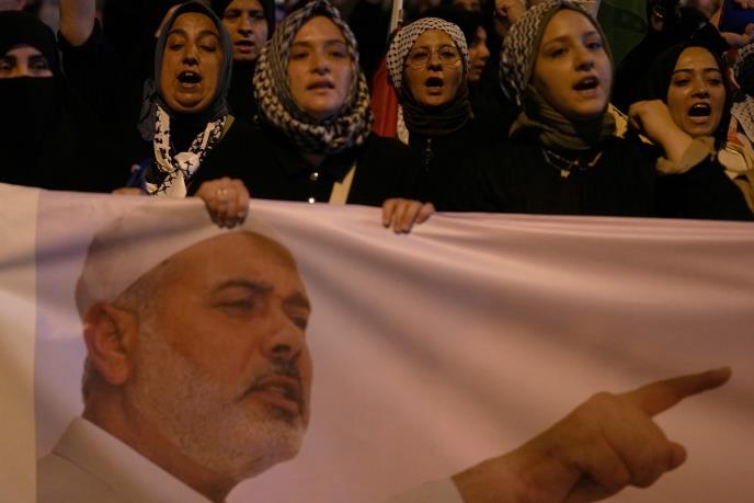 Demonstranti su držali plakate sa fotografijama Hanijea i transparente na kojima je pisalo: „Jerusalim je naš cilj, a vaš put je naš put“.