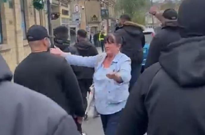 Snimak podeljena na X-u prikazuje kako muslimani grle jednu ženu i rukuju se s drugim muškarcem ispred onoga što izgleda kao pab s engleskom zastavom obešenom na prozoru.