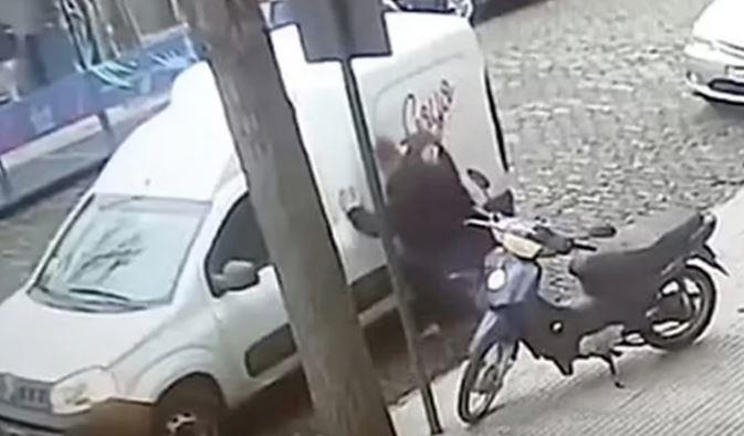 Na snimku nadzorne kamere se vidi trenutak kada nešto privuče pažnju vozača dostavljača dok primećuje gvozdenu šipku koja viri iz zemlje, kojom je navodno izgrebao šasiju svog kombija.