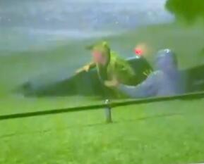 Uspaničeni reporter je krenuo do obližnjeg policajca dok je opisivao kako je voda "tako brzo nadolazila", ali dok je to učinio, čovek koji je bio u prolazu je skočio u akciju i prišao automobilu držeći čekić u ruci.