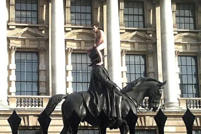 LONDON - Policija i očevici izjavili su danas da su primetili nagog muškarca koji se popeo na vrh konjičke statue u srcu Vajthola, oblasti u Londonu koja je sedište vladinih kancelarija.