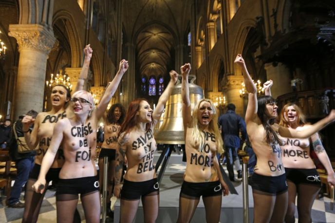 Na grudima i leđima imale su ispisane poruke "Ne za homofoba", "Kriza vere" i "Baj, baj, Benedikt!". Žene u toplesu policajci su izbacili iz Notr Dama, a ispred katedrale su se zadržale još desetak minuta.