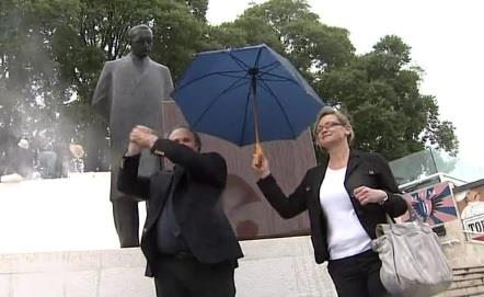 Uprkos kiši, Kerum je pred spomenikom malo držao ruku na srcu, a zatim je pokazao stisnutu šaku. Gradonačelnik je potom sklopio ruke iznad glave, namestivši su u položaj karakterističan za Tuđmana
