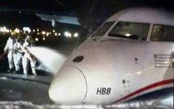Avion, u kome su se nalazili 31 putnik i tri člana posade, kružio je iznad Njuarka u pokušaju da izbaci točkove, a posle nekoliko neuspešnih pokušaja, avion je sleteo na trup, rekao je Enderson i dodao da su putnici evakuisani i prebačeni na terminal autobusom.