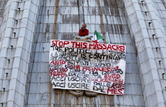 Marčelo De Finicio nosio je transparent sa natpisom na engleskom jeziku "zaustavite ovaj pokolj.... politički horor šou se nastavlja" i poruku "pomozi nam papa Franjo" na italijanskom. Demonstrant je mahao italijanskom zastavom koju je postavio na mali prozorčić blizu vrha kupole, koja je visoka 137 metara.