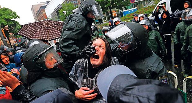 Oko 3.000 demonstranata, pod sloganima „Humanost ispred profita“ i „Rat počinje ovde“, sukobilo se sa oko 2.500 policajaca, koji su postavili barikade oko zgrade ECB.
