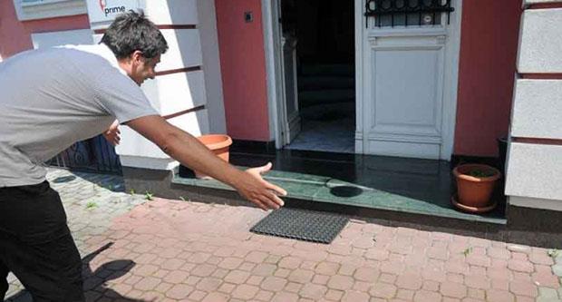 Kad je osetila opasnost od zaposlenih, koji su pokušali da uđu u zgradu u kojoj rade, preplašila se, sklupčala i počela da preti glavom.