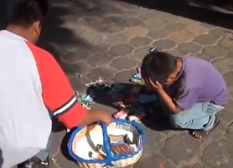 Dečak, pripadnika meksičkih Indijanaca plemena Tzotzil, kako video pokazuje, neutešno plače dok mu inspektor iz korpe vadi cigarete i tera ga da baci slatkiše na ulicu.