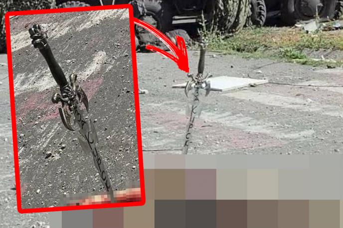 Na njima se vidi da sečivo zabodeno u telo žrtve na kojem je ispisana poruka "Za Kursk".
