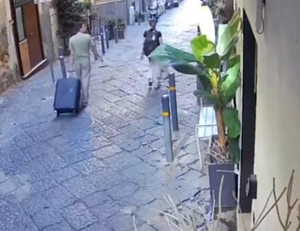 Na snimku sa nadzorne kamere vidi se Kjara Jakonis (30) kako šeta ulicom sa dečkom. Oboje nose kofere u rukama i krenuli su na aerodrom kada je odjednom statua pala sa zgrade.