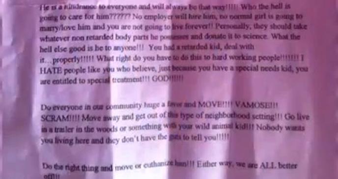 "Ni jedan poslodavac ga neće zaposliti, ni jedna normalna devojka se neće udati za njega ili ga voleti, a vi nećete živeti vječno! Mislim da bi mu trebalo uzeti sve 'neretardirane' delove tela koje poseduje i donirati ih nauci", stoji u nastavku pisma u kome se još savetuje porodici da se iseli iz naselja.