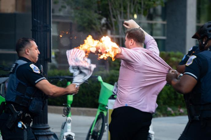 Čovek, identifikovan kao fotoreporter Semjuel Mena, vrišti od bola nakon što je zapalio levu ruku nasred ulice, dok šokirani policajci i prolaznici pritrčavaju u pomoć, kako se vidi na brojnim snimcima koji kruže internetom.