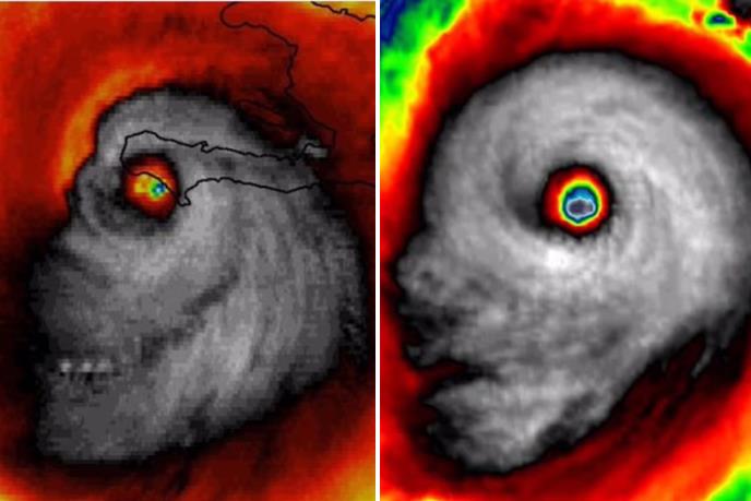 Stu Ostro, viši meteorolog na "Weather Channel", podelio je jezivu fotografiju na platformi X, prikazujući je pored slične slike uragana Metju 2016. godine. Činilo se da Milton "gleda" jednim okom, sa jezivim osmehom na "licu" dok se uvijao u Zalivu i jurio prema Floridi.