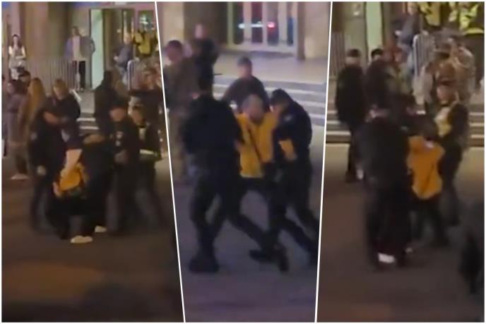 U klipu se vidi kako muškarac u panici pokušava da se izvuče iz policajčevog stiska, dok više žena sve to snima.