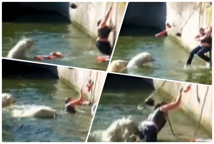 Na strmom zidu koji je odvajao medvede od publike, dočekali su je čuvari zoološkog vrta koji su očajnički bacali gume za spasavanje prema ženi, dok su drugi bacali meso i gurali medvede da ostave ženu na miru.
