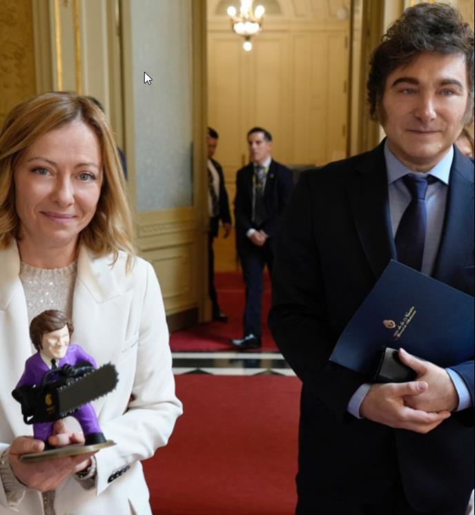 Argentinski predsednik Havijer Milei uručio je italijanskoj premijerki Đorđi Meloni bizaran poklon: figuricu samog sebe sa motornom testerom.