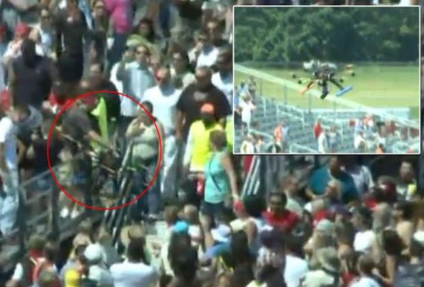 Dron, kojeg pokreće i u vazduhu održava nekoliko propelera, prosto se obrušio na ljude u publici.