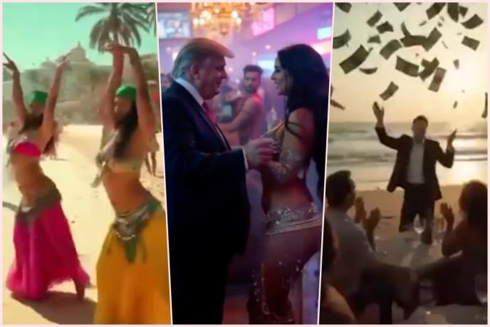 Tu je i veliki zlatni kip Donalda Trampa, postavljen usred Gaze, ali i američki predsednik koji pleše s trbušnom plesačicom i Ilon Mask koji jede.
