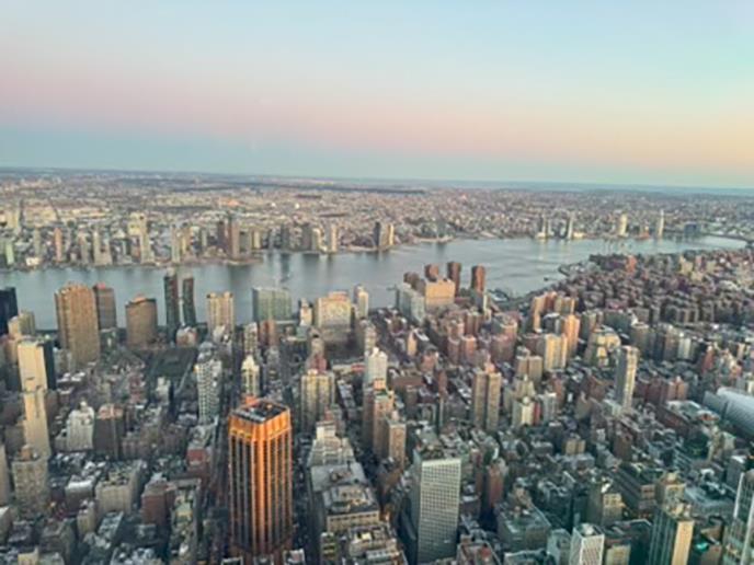 Preda mnom - ceo Njujork i sunce na horizontu kao blagoslov. Polako se pale gradska svetla a sunce, džinovska narandža na horizontu, razliva svoje boje preko majušnih oblakodera ispod sunca i nas.