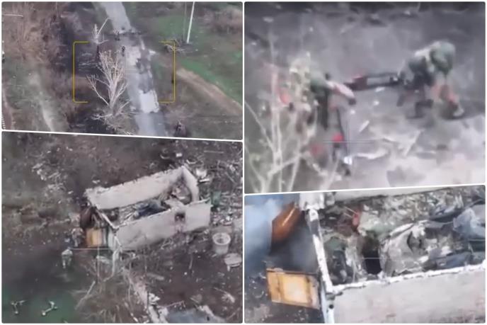 Na snimak, za koji nije jasno gde je tačno i kada je nastao, trojicu vojnika koji voze elektirčne trotinete napadaju dronovi kamikaze.Snimak se završava u trenutku kad jedan dron udara u tlo pored vojnika.
