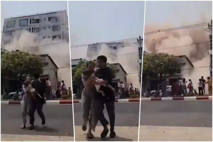 Jedan od najpotresnijih dolazi iz Mjanmara gde se vidi kako dvoje mlade ljudih trče sa detetom u naručljnu dok se iza njih zgrada ruši kao kula od karata.
