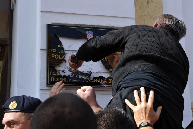 "Odjednom su nasrnuli na njih, saterali ih uz stakleni zid i čekićem razbili i skinuli sa zgrade dvojezične ploče s natpisom poreske uprave. Trajalo je to oko minut i po, nakon čega su se demonstranti povukli, kao i policajci od kojih je jedan u guranju zadobio povredu i povukao se držeći se za vrat, dok se jedna policajka bolno držala za rame", objavio je hrvatski list.