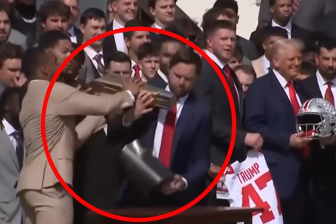 Na snimku koji je objavio CBS njuz vidi se da su Tramp i Vens na travnjaku ispred predsedničke rezidencije ugostili šampionsku ekipu Univerziteta Ohajo Stejt, koja je osvojila titulu koledž šampiona u američkom fudbalu.