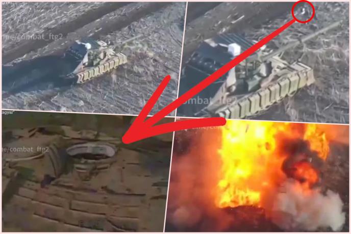 Britanski San objavio je na svom Jutjub kanalu snimak na kojem se vidi kako dron lebdi blizu tenka i potom uleće u otvor na kupoli, nakon čega sledi ogromna eksplozija.