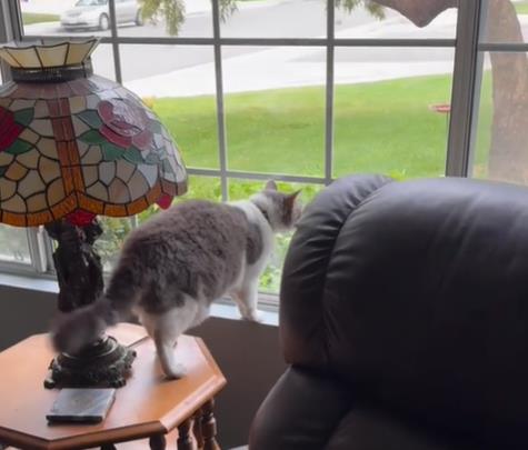 Na objavljenom snimku vidi se mačka kako sedi na stoliću u dnevnoj sobi i posmatra šta se dešava napolju, a kako je Keti En otkrila, videla je drugu mačku i počela da "laje".