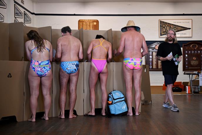 Birači koji su glasali u blizini plaža, uključujući Bondi, dolazili su na biračka mesta nakon plivanja, noseći kratke kupaće gaće ("budgy smugglers").