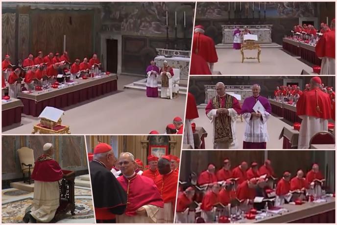 Na snimku se vidi papa Lav XIV kako izgovara molitvu pred članovima Kardinalskog zbora s oltara povijesne rimske katedrale, nakon čega se povlači i privatno se moli. Na kraju se vidi kako se s osmehom rukuje s kardinalima.