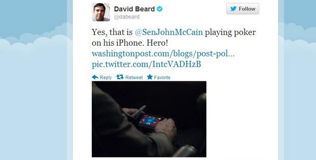 VAŠINGTON - Američki senator Džon Mekejn odlučio je da se tokom jučerašnje rasprave u američkom Senatu u Siriji malo razgali i opusti pa je ispod poslaničke klupe zaigrao poker na svom ajfonu.