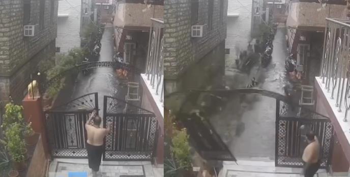Jedna nesvakidašnja scena je slučajno zabeležena nadzornom kamerom, kada je zid stambenog kompleksa popucao pod naletom vode i srušio se tik pored čoveka koji je izašao da proceni štetu.