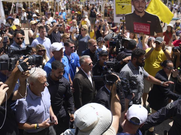 Vitkof je u pratnji telohranitelja pešice stigao na trg u Tel Avivu, gde su se okupili rođaci 49 ljudi koji su još uvek zarobljeni u Gazi, mada se ne zna da li su svi živi, a oteti 7. oktobra 2023. godine, tokom inicijalnog napada Hamasa.