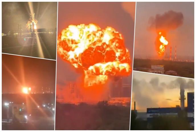Ruski opozicioni kanal Astra objavio je video snimke i fotografije meštana na kojima se vidi velika eksplozija i plamen iznad rafinerije Kiriši posle napada, piše Kijev independent.
