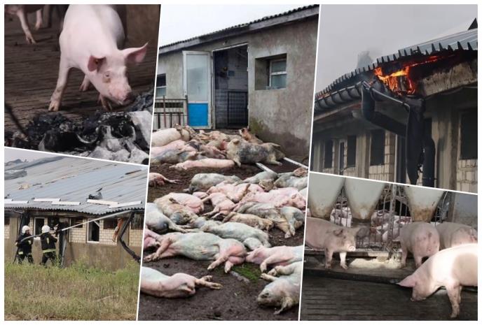 Fotografije koje je objavila Državna služba za vanredne situacije Ukrajine prikazuju tela svinja nagomilanih u objektima, od kojih su mnoge spaljene i osakaćene u požaru.