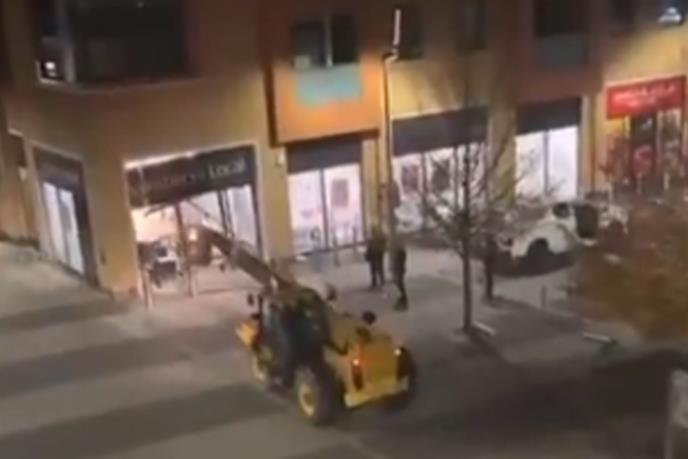 Na snimku, koji su zabeležili stanovnici koji žive u blizini, može se videti kako teška mašina izvlači bankomat iz zida, ostavljajući veliku štetu na prodavnici.