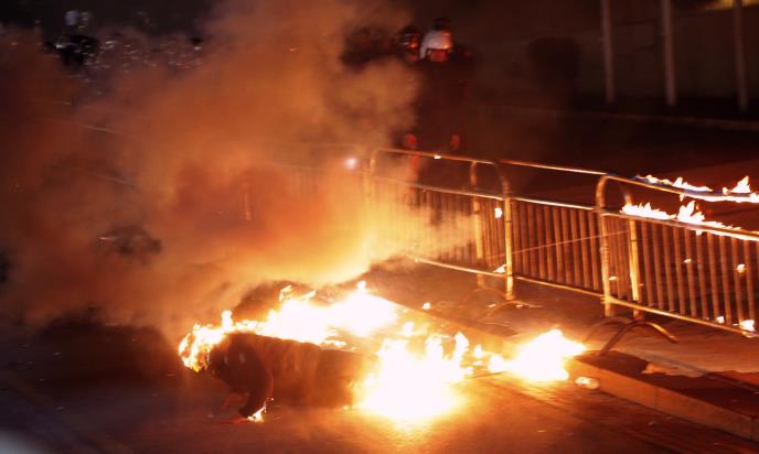 Dok su demonstranti bacali Molotovljeve koktele, policija u opremi za razbijanje demonstracija štitila je zgradu vlade, ali nije uspela da potisne demonstrante.