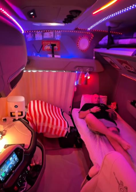 Nakon buđenja, on uredno slaže posteljinu, presvlači se i obavlja jutarnju higijenu, koristeći mali prostor maksimalno funkcionalno. U kabini postoji i odvojen prostor za prtljag i lične stvari, a posteljinu odlaže ispod kreveta kako bi sve bilo uredno i organizovano.