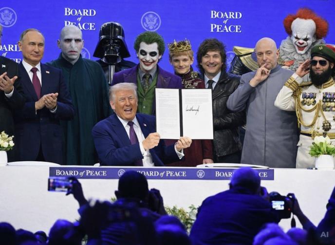 Fotomontaža prikazuje Trampa kako sedi za stolom sa oznakom „Odbor za mir“ i drži potpisan dokument, dok se oko njega, umesto stvarnih političkih saveznika, nalaze izmišljeni i negativni likovi iz popularne kulture i filmova, uključujući Džokera, Darta Vejdera, Voldemora, Penivajza, dr. Evilu i niz drugih likova koji simbolizuju zlo, haos ili autoritarnu moć. Među njima je i ruski predsednik Vladimir Putin, čime je Njusom dodatno naglasio ironiju cele scene.