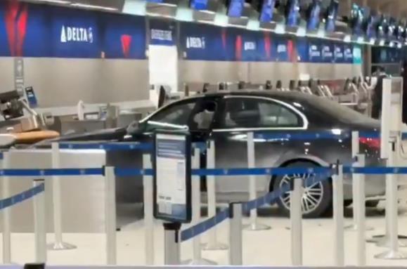 Nije jasno kako je automobil probio staklena vrata, a fotografije prikazuju metalne barikade ispred ulaza u terminal.