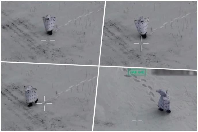 Na snimcima se može videti ruski vojnik u širokom, belom odelu, koji se nespretno spotiče i biva uočen pre nego što je eliminisan pomoću drona.