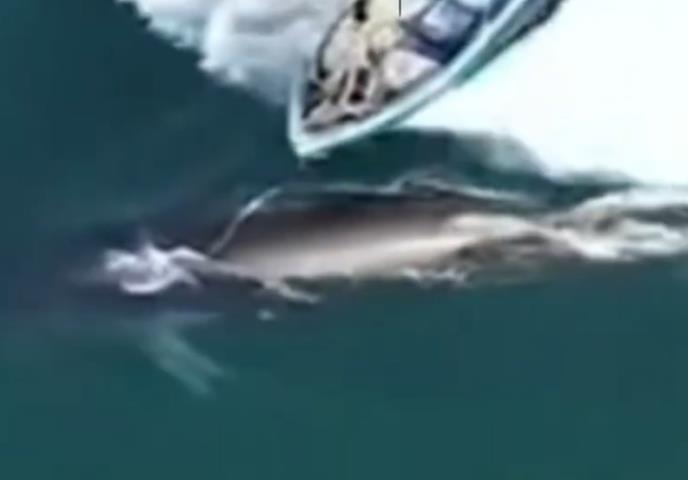 Nekoliko trenutaka kasnije vidi se ribarski brod kako prolazi tim područjem bez usporavanja i prelazi direktno preko leđa kita.