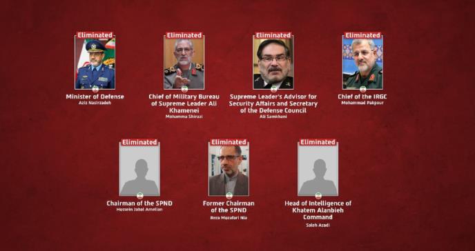 Među njima se nalaze Aziz Nasirzadeh, ministar odbrane, Mohamad Širazi, šef vojne kancelarije vrhovnog verskog vođe Alija Hamneija, Ali Šamkani, savetnik vrhovnog vođe za pitanja bezbednosti i sekretar ministarstva odbrane, Mohamad Pakpour, šef Iranske revolucionarne garde, Hosein Džabal Amelian, šef Organizacije za odbranu inovacije i istraživanje, Reza Mozaffari-Nia, bivši šef Organizacije za odbranu i Saleh Asadi, šef obaveštajne komande Hatem Alanbih.