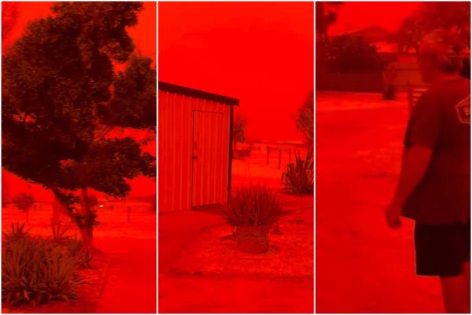 Šokantni snimci snimljeni tokom oluje u Zalivu morskih pasa pokazuju kako je dnevna svetlost nestala za nekoliko minuta dok su jaki vetrovi podizali ogromne oblake prašine bogate gvožđem, pretvarajući nebo u duboko grimiznu boju i smanjujući vidljivost na nulu.