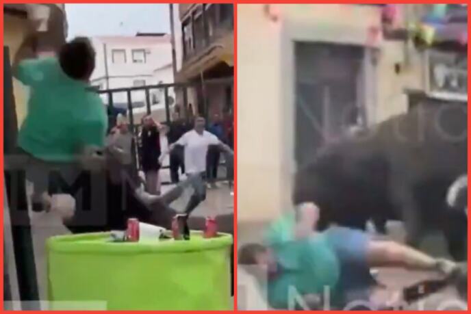 Jezivi snimci prikazuju uzgajivača bikova kako pokušava da se skloni iza barijere u ulici Palomares. Dok se otac dvoje dece krio iza bureta, životinja ga je dohvatila rogovima i bacila u vazduh.